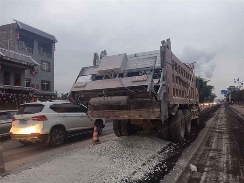 2.然后使用集料撒布機(jī)將新加的碎石和石屑(已按 1:1 比例預(yù)先混配好)均勻撒布于銑刨料之上;