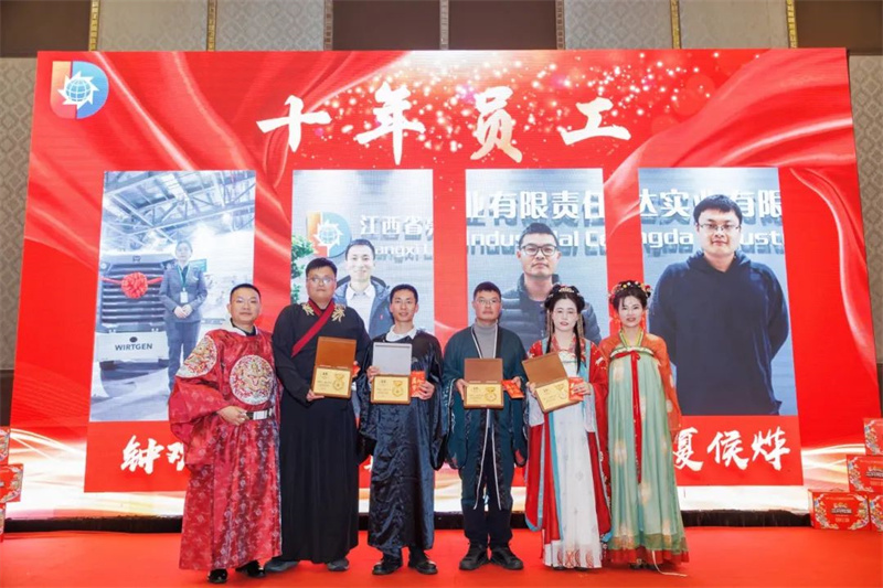 在近一個(gè)多小時(shí)的歡慶之后,江西亮達(dá)的十年員工鐘歡、曾纛、謝科強(qiáng)和夏侯燁紛紛走上臺(tái)前,分享了他們?cè)诠臼觊g的點(diǎn)點(diǎn)滴滴。他們的話語(yǔ)中充滿了對(duì)江西亮達(dá)的深情和感激,讓在場(chǎng)的每一位觀眾都深受感動(dòng)。隨后,董事長(zhǎng)顏總和總經(jīng)理盧總親自上臺(tái)為這些老員工頒發(fā)了獎(jiǎng)項(xiàng),這不僅是對(duì)他們多年辛勤工作的肯定,也激勵(lì)著臺(tái)下的年輕員工,展示了公司對(duì)員工的重視和對(duì)未來(lái)的期望。十年的志同道合,十年的風(fēng)雨同舟,十年的同甘共苦;這一刻,是江西亮達(dá)團(tuán)隊(duì)凝聚力和堅(jiān)持精神的生動(dòng)體現(xiàn),希望新的一年老員工和新員工們可以齊心協(xié)力,在公司中謀求更好地發(fā)展,實(shí)現(xiàn)自己的個(gè)人價(jià)值。