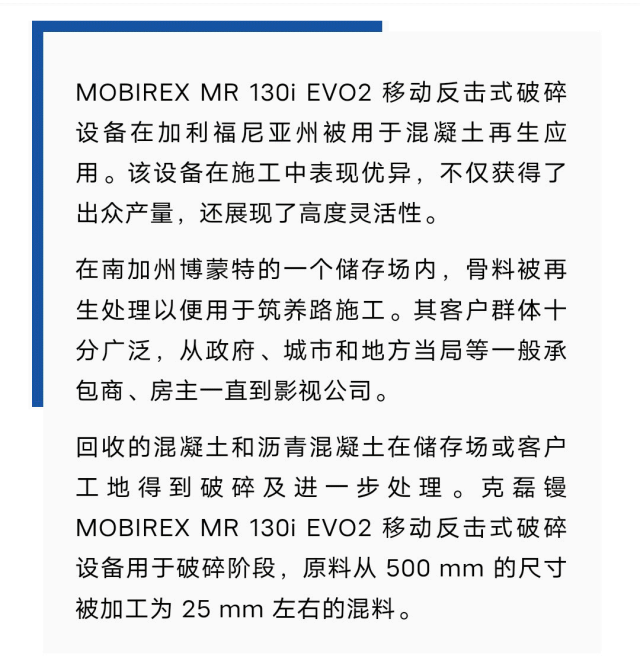 海外風采 | 克磊鏝 MOBIREX 移動反擊式破碎設備在加利福尼亞州再生混凝土